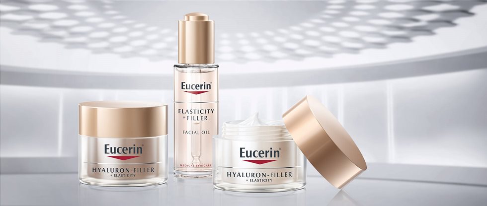 The Eucerin Hyaluron-Filler + Elasticity range has been specially formulated to address a loss of elasticity. Eucerin’s blend of high and low molecular Hyaluronic Acid, Arctiin and Silymarin in the day and night creams plumps up deep winkles and improves elasticity while the nourishing oil formula of the Elasticity + Filler Facial Oil improve elasticity and support resilience. Skin feels firmer and looks fresher and more radiant.