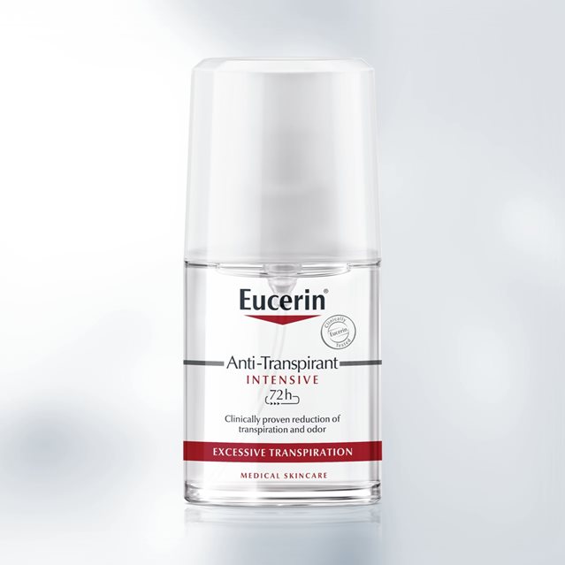 Antiperspirants act on the eccrine and apocrine sweat glands, reducing sweat secretion. Because there’s less sweat you’ll notice less dampness and less odor. Antiperspirants contain active substances such as Aluminium Chlorohydrate (ACH) and Aluminium Chloride (AC). Eucerin 48h Anti-Transpirant Roll-On contains ACH and Eucerin 72h Anti-Transpirant Intensive Pump Spray contains both ACH and AC. AC molecules are smaller and have a lower pH value than ACH molecules so they can get even deeper into the sweat ducts and keep them closed for longer. Even small quantities of antiperspirant can effectively reduce sweating. You can read more about how deodorants and antiperspirants work in sweating – what it is and how it affects people.