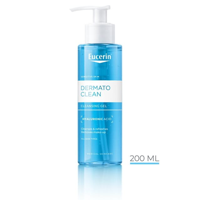 Eucerin® DermatoClean Cleansing Gel is a mild & effective facial cleanser that thoroughly yet gently cleanses, eliminates excess sebum and removes impurities and make up. The formula with Hyaluronic Acid and other moisturizing ingredients does not dry out the skin. The formula supports a healthy skin barrier and maintains skin's pH level. Free of fragrance.