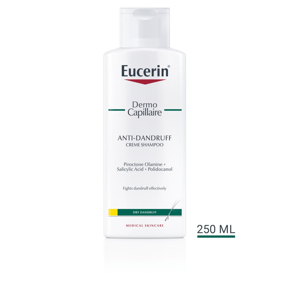 Eucerin DermoCapillaire Anti-Dandruff Creme Shampoo has been specifically designed for dry dandruff. It gently cleanses your scalp and hair of white flakes and scales and effectively reduces and controls dandruff with regular use. Its mild formula soothes your scalp and reduces itching, for a clean and healthy appearance of hair and scalp.