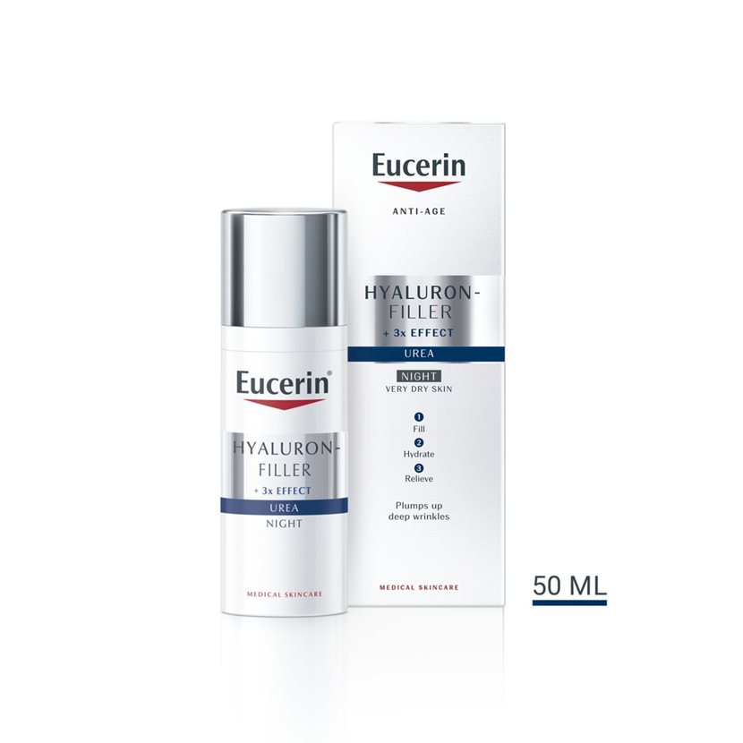 If you have dry to extremely dry skin with wrinkles. Eucerin Hyaluron-Filler + Urea Night is designed to quickly moisturise dry skin and reduce the appearance of wrinkles.