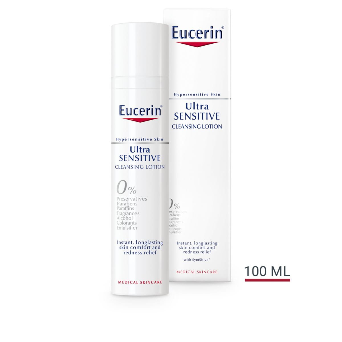 Eucerin UltraSENSITIVE Cleansing Lotion contains SymSitive*, an innovative active ingredient especially developed for hypersensitive skin. It acts as a sensitivity regulator at the source of the hyper-reactivity, minimising sensory fibre activation and, in turn, soothing hypersensitivity instantly. Eucerin UltraSENSITIVE Cleansing Lotion instantly calms and soothes irritation and relieves redness, making it a fundamental part of the daily care routine for hypersensitive skin. Following cleansing, use Eucerin UltraSENSITIVE Soothing Care Dry skin or Eucerin UltraSENSITIVE Soothing Care Normal to combination skin when the dominant skin problem is an unpleasant skin feel such as burning, stinging or itching. If skin shows visible signs of redness, there are signs of inflammatory skin diseases like Rosacea, or if an SPF is wanted, use Eucerin AntiREDNESS Soothing Care or Eucerin AntiREDNESS Concealing Day Care SPF 25. As with all products in the Hypersensitive Skin ranges, Eucerin UltraSENSITIVE Cleansing Lotion uses anti-contamination packaging with a dual valve system. * =reg.tm of Symrise AG, Germany