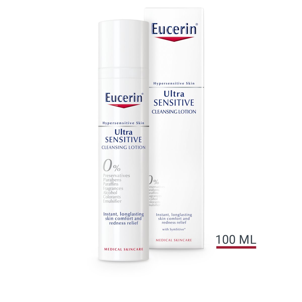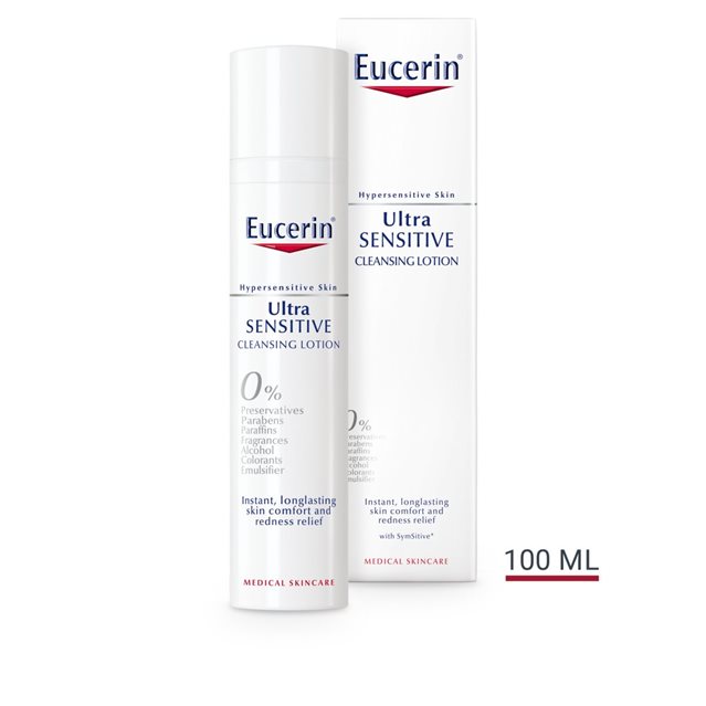 Eucerin UltraSENSITIVE Cleansing Lotion leaves hypersensitive (including redness/Rosacea/Couperose-prone skin) thoroughly cleansed while its 'pure' formula contains only a limited number of ingredients to minimise intolerance and allergic reactions. The UltraSENSITIVE Cleansing Lotion has no surfactants, and is very gentle to the skin, yet it is powerful enough to remove make-up.