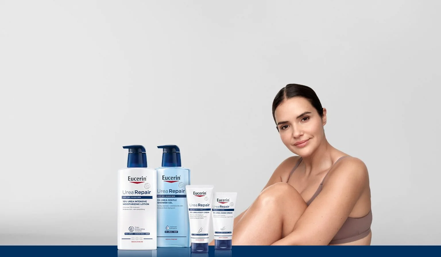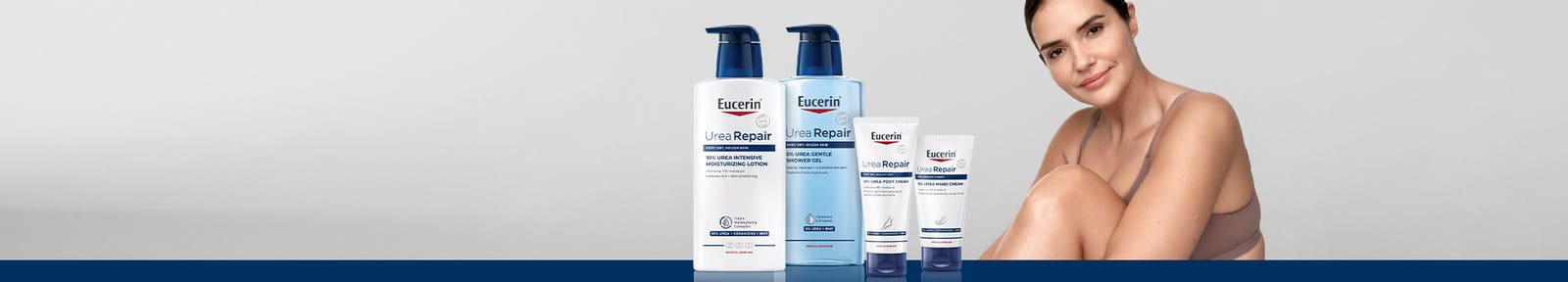 Eucerin UreaRepair offers a comprehensive range of products which includes a shower gel, body lotions (including hand and foot care products) and an intensive treatment cream for problem areas of extremely dry skin. These products are available with different concentrations of water-binding active Urea, and the concentration used should vary according to the severity of dryness.