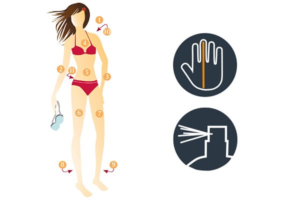 It’s easy to forget your décolleté, arms and hands on moderately sunny days or your legs if you are wearing shorts. And, when sunbathing, areas such as the back and shoulders as well as your hands and feet, the backs of the arms and the areas at the edges of swimwear are easy to miss.